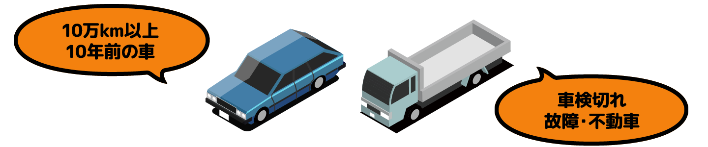 日本では走行距離10万km以上の車や、10年前の車、ボロボロになった車などは中古車市場でほぼ需要がないため、中古車販売店などには買い取ってもらえないケースがほとんどです。逆に廃車費用を請求 されてしまうことも。ディーラーや中古車買取店で値段がつかなかったり、処分の費用をとられてしまうような、年式の古い車や走行距離の多い車、車検切れの車、チェックランプが点灯していたり、故障して動かない車などもおまかせください。0円以上での買取を保証しております!愛車を手放すご相談を一度当店へ!